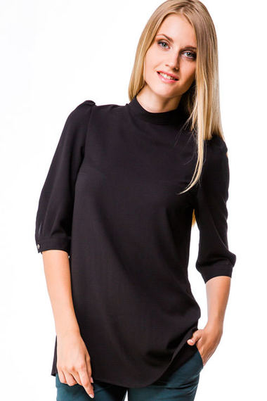 Стильная черная блузка из черного креп-шифона. Модель удлиненная, свободного кроя, с рукавам 3/4. Оригинальность данной блузке придает застежка на пуговицы сзади.